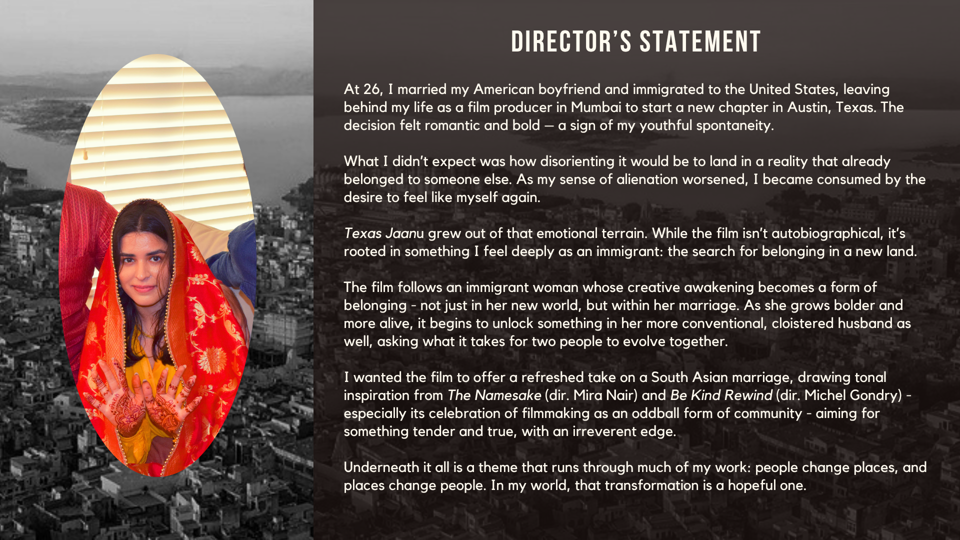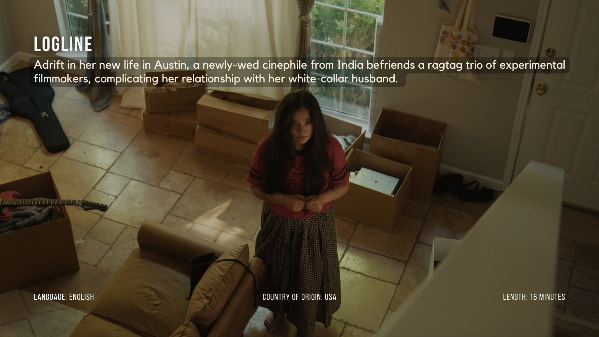 Logline: Adrift in her new life in Austin, a newlywed cinephile from India befriends a ragtag trio of experimental filmmakers, complicating her relationship with her white-collar husband.